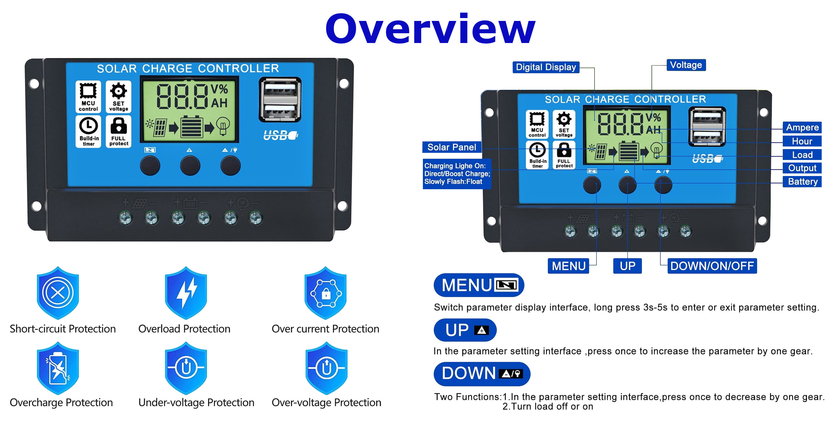 This 12V/24V 100A is an Intelligent PWM solar charge controller for a solar power system to charge the lead-acid batteries and power up the load. It features a Digital LCD and input Button keys for the interface, and advanced features like built-in short-circuit protection, open-circuit protection, reverse voltage protection, overload protection, etc., making it ideal for off-grid power systems.