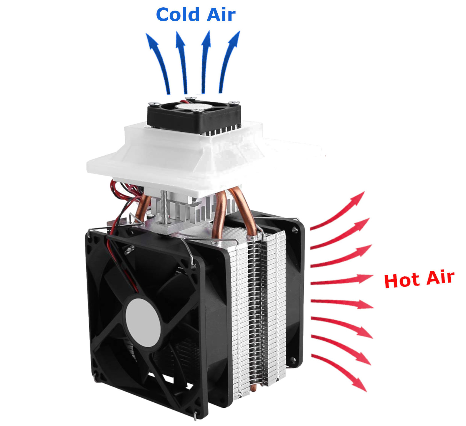 This assembled kit, contains the Peltier module, heatsink, Condensor, fans, fan drop mount plate, heatsink paste, screws, and connecting wires required to build your own air cooling and heating system.