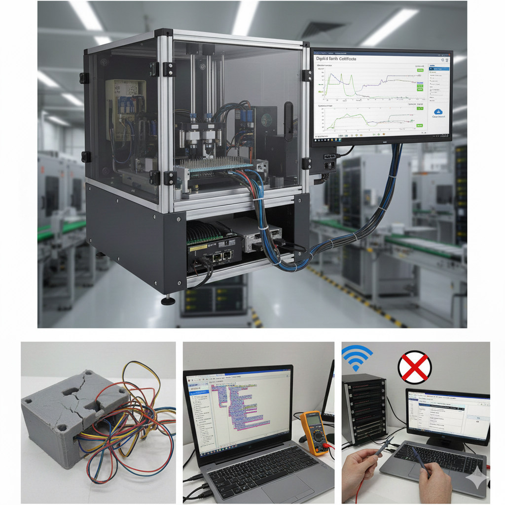 • Factory Network Resilience: A DIY script often fails when the internet drops. Our professional systems include Local Buffering. If the factory Wi-Fi goes down, the ATE continues to test and logs data to a secure local database, syncing to the cloud automatically when the connection returns. The production line never stops.