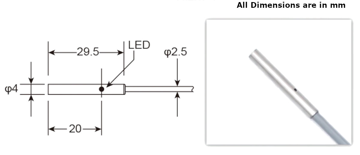 This Inductive Proximity Sensor features an M4 Smooth Tube with a Probe head and allows a wider sensing range at the potential cost of false triggering from its surroundings. These sensors are best in applications where space is not an issue, and a broader sensing area is necessary. This will come with a small sensing range of 1mm and operates at 6-36 VDC and outputs a NPN NO signal.