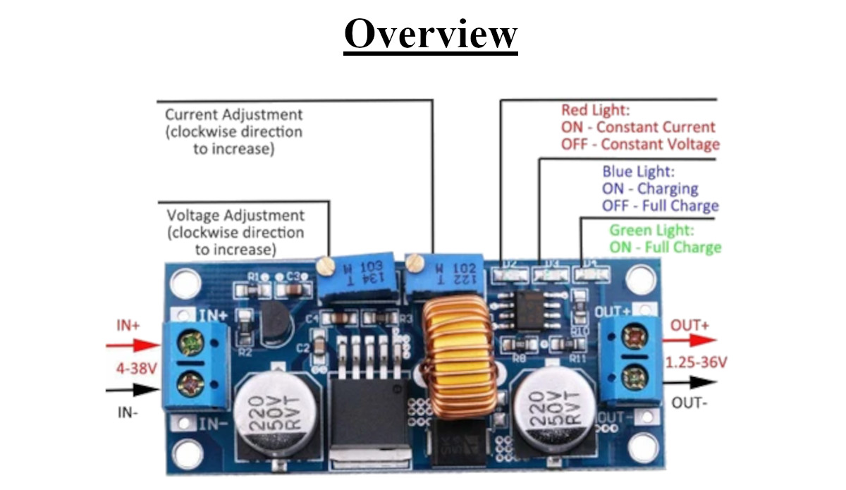 Probots™ ProSpec Grade Power Integrity Unlike basic regulators, the XL4015 is Probots™ ProSpec Grade , featuring high-quality filter capacitors and a robust inductor to maintain stable output even under significant loads. The module includes three onboard status indicators: a Red light for constant current mode, a Blue light to show active charging, and a Green light to signal a full charge or idle state.